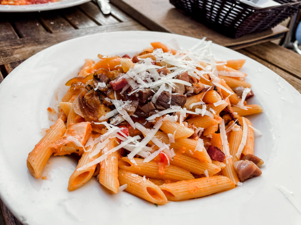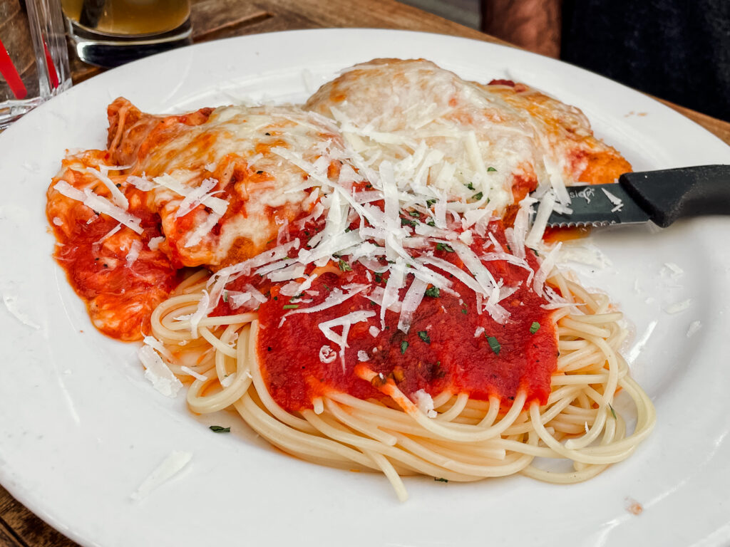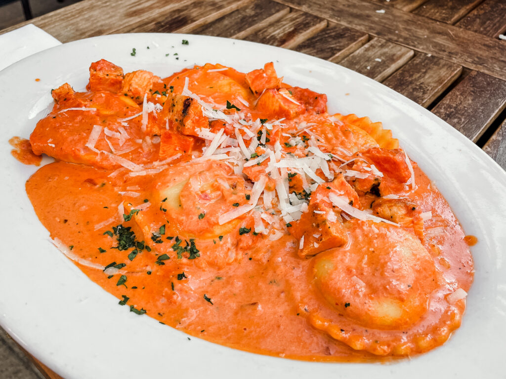 My favorite dish at Grape Street is definitely the Jumbo Cheese Ravioli. The ravioli is filled with romano, mozzarella, and ricotta, smothered in pink sauce and finally I always add the grilled blackened chicken to mine.