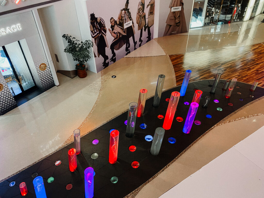 The Halo at The Shops with Crystals is a spectacular water feature that offers visitors an amazing experience. Multiple vortexes spiral out from clear cylinders protruding through the floor, each one being accentuated by colorful lights for added effect and making your walkthrough feel like you’re walking inside some kind of futuristic organism!